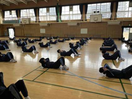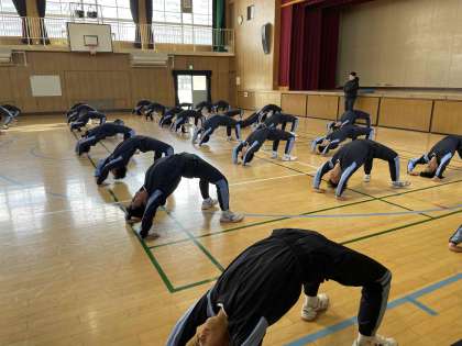体育館にて念入りに補強運動をした後、10分間走を行いました。