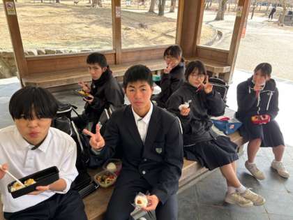 奈良公園に到着し、昼食を食べています。