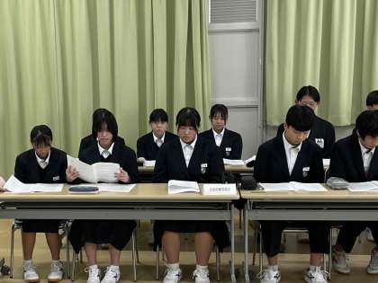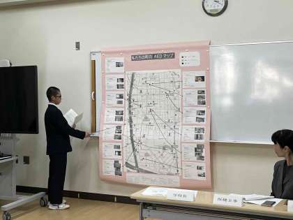 生徒保健委員会が、自分たちで足を運び、作りあげた「私たちの町のAEDマップ」の説明をします。