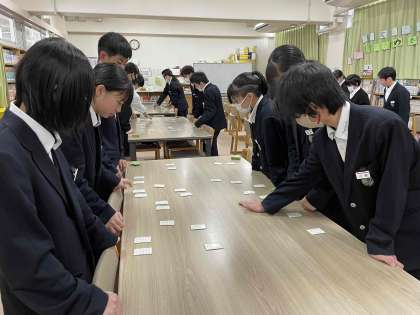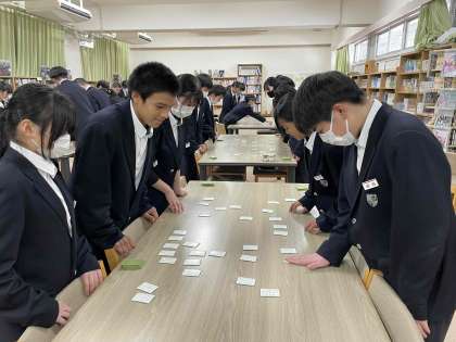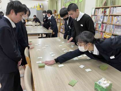 明日の本番に向け、図書室で百人一首の対戦をしました。