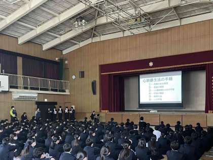救急救命講習の内容や近隣施設のAED設置場所、先日の学校保健委員会における心臓マッサージの様子などを紹介してくれました。
