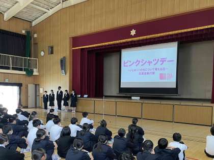 本校では校長先生の講話と生徒会執行部によるピンクシャツ運動に関する案内がありました。