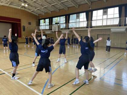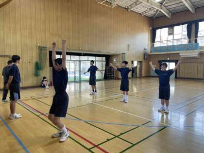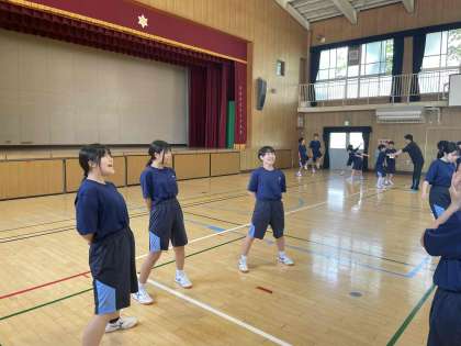 グループに分かれ。2年生が1年生にラジオ体操を細部にわたり教えました。