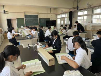 理科室で顕微鏡の使い方を習い、ミジンコやアオミドロなどを見ました。