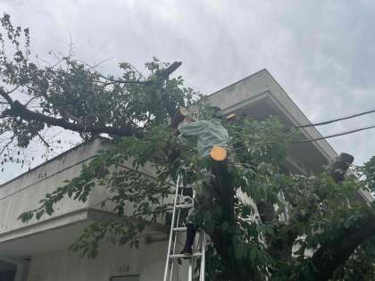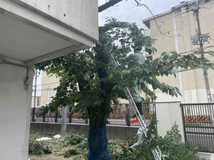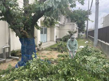 営繕園芸事務所が応援に来てくださり、管理作業員さんとともに西門そばの桜を剪定してくださっています。