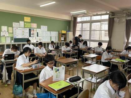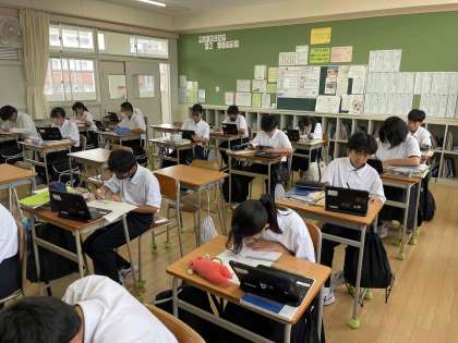 壁新聞作りのためタブレットを使い、それぞれ選んだ国について調べ学習をしました。