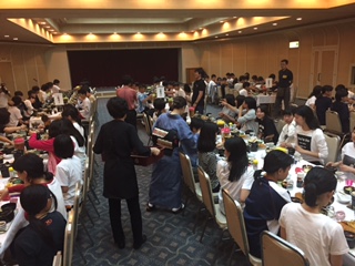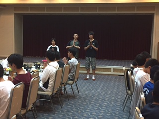 入館式を終えた子どもたちは午後の体験プログラムを終えてお腹がすきました。待ちに待った夕食の時間です。3年生みんなで食べる夕食はおいしいです。しっかりと食べましょう!この後はレクリエーション大会です。レクリエーション大会の様子は明日、ホームページで紹介します。乞うご期待!!