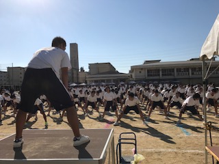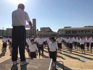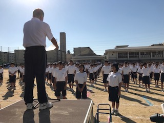 プログラム26番 整理体操、そしてすべての競技を終えた子どもたちは結果発表を受けて校長先生から表彰を受けました。第70回体育大会は秋晴れのもと子どもたちが持てる力を発揮して素晴らしい体育大会となりました。クラスの仲間と協力した力を次は文化祭、合唱コンクールにつなげてください。また、普段の学級活動においても体育大会で魅せた力を活かして勉学に励んでください。