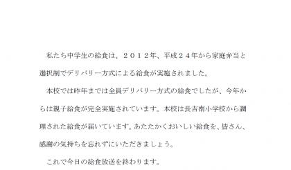 10月4日(水)の給食の時間に環境委員による給食の放送を行いました。本日は給食の歴史について全校生徒に話をしました。みなさん、いかがでしたか?