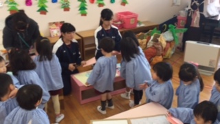 長吉南小学校、第2幼稚園で子どもたちが職場体験学習を取り組んでいる様子です。子どもたちに囲まれて緊張気味ですね。