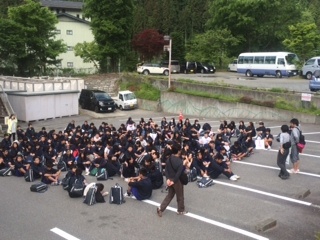 退館式の子どもたちの様子とお世話になった宿舎の写真です。