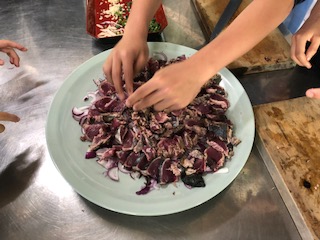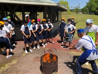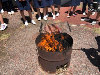 捌いたカツオを火に炙っています。美味しいカツオのたたきが出来あがっています。