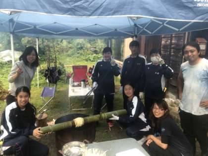 1日目の農村体験の様子です、教わりながらバームクーヘンを作っています。