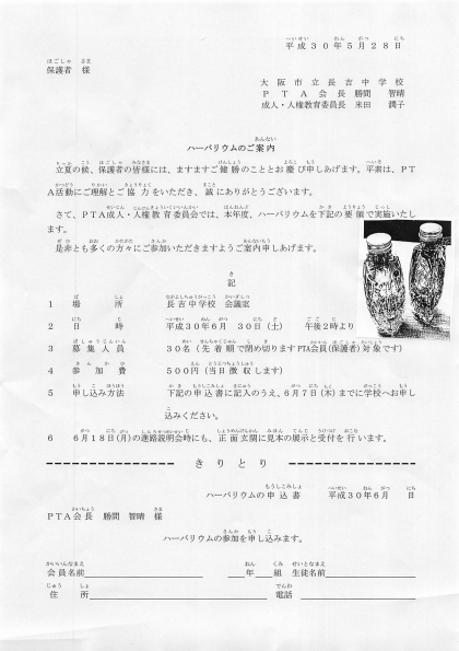6月30日(土)の午後2時よりPTA成人・人権委員会よりハーバリウムの講習会を行います。PTAのみなさま、奮ってご参加ください。