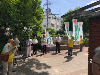 午前10時より六反東公園に保護司さんをはじめとする地域の方々が集合し、長原東地域の各所で啓発活動を行いました。