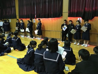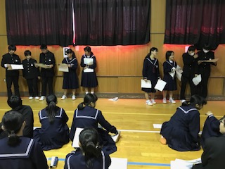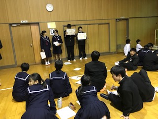 3月12日(火)5時間目、1年生では現在、数学科の授業で資料(データ)をグラフなどを用いて分析し、その資料を読み取る学習をしています。本活動では、資料の特徴を読み取るだけでなく、グループで題材を決定し、特徴や傾向を読み取り、発表する。そうすることで、より資料(グラフ)で表すことの有用性を学ばせ、自分たちの意見を自身で発信する力を身につけさせることを目指しました。