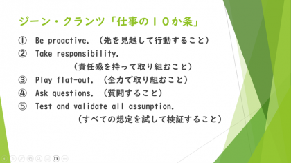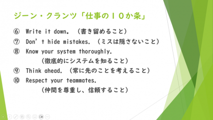 ジーン・クランツの「仕事の十か条」、皆さんはどのように感じましたか。これらは私たちがこの学校で毎日を過ごすときにも、とても役に立つものだと思います。