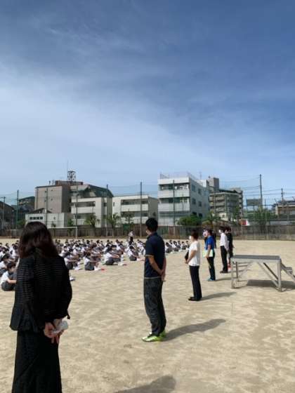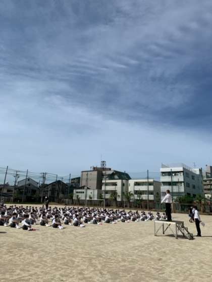 生徒たちは、登校したらすぐ、分散教室へ入り健康観察の後、運動場で始業式を行いました