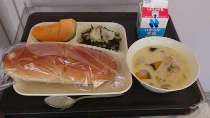 パン・牛乳・カボチャのクリームシチュー・ミックス海藻サラダ・クインシーメロンでした。たくさん食べて健康な体を作っていきましょう。