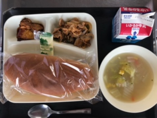 今日の給食では、卵、牛乳、砂糖、クリームを使い、蒸し焼きにした「焼きプリン」にしています。