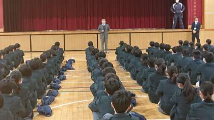3学期始業式は、雨天のため体育館で2回に分けて行いました。