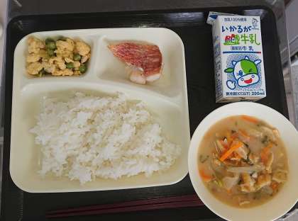 【 献立 】 あかうおのしょうゆだれかけ みそ汁 えんどうの卵とじ ごはん 牛乳