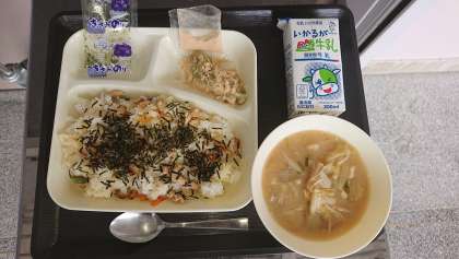 【 献立 】 かやくご飯 じゃがいもの味噌汁 まっ茶ういろう ごはん 牛乳