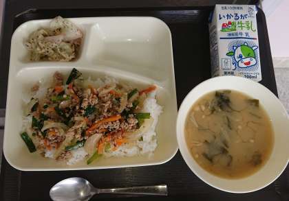 【 献立 】 豚ひき肉とにらのそぼろ丼 みそ汁 キャベツの赤じそあえ 牛乳