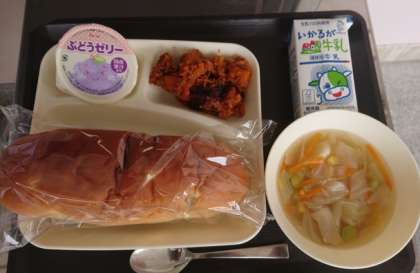 【 献立 】 かぼちゃのミートグラタン スープ ブドウゼリー パン 牛乳