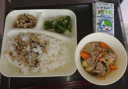 【 献立 】 豚肉とじゃがいもの煮もの オクラの梅風味 ツナっ葉いため ごはん 牛乳