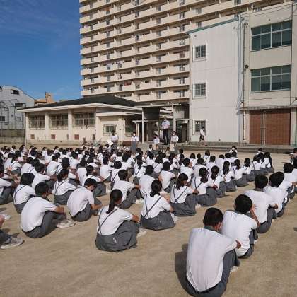 特別時間割になっているので注意してください。また、9月17日(土)も授業を行います。事前に習い事等で欠席する場合は生徒手帳を通じて担任に伝えるようにしてください。また、本日からインターンシップとして西山涼香さん(大学2回生)が、学校の仕事について学ぶために来校しています。写真は挨拶の様子です。