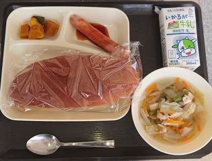 【献立】 パン ウインナーのケチャップソース スープ 焼きかぼちゃ 牛乳