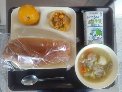 【献立】 パン 豚肉と野菜のスープ煮 変わりピザ みかん 牛乳