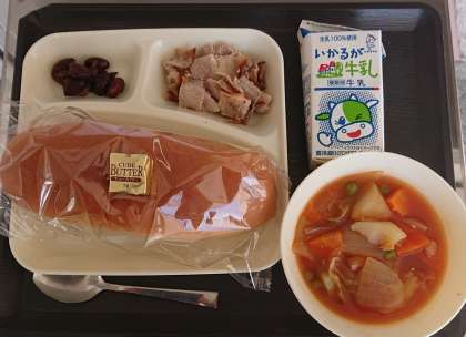 【献立】 豚肉のガーリック焼き ケチャップ煮 うずら豆のグラッセ パン バター 牛乳