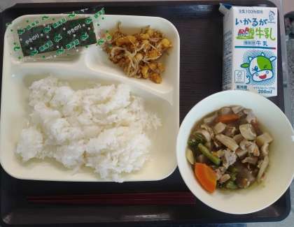 【献立】 筑前煮 じゃこ豆 焼きのり ごはん 牛乳