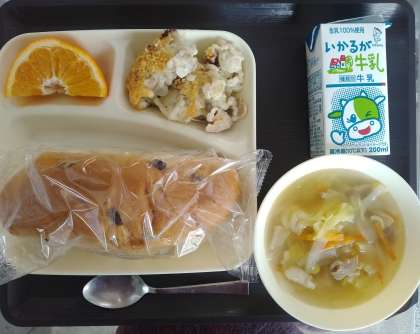 【献立】 押麦のグラタン 豚肉と野菜のスープ いよかん パン 牛乳
