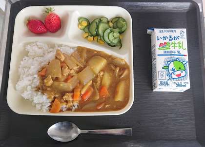 【献立】 チキンレバーカレーライス きゅうりとコーンのサラダ いとご 牛乳