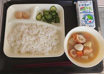 【献立】 関東煮 きゅうりの梅風味 白花豆の煮もの ごはん 牛乳