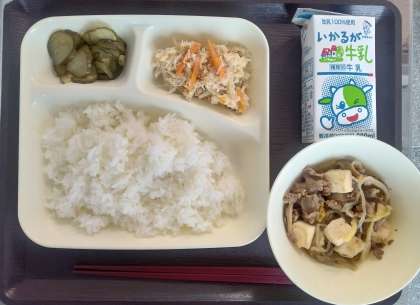 【献立】 すき焼き煮 もやしとささみのいためもの きゅうりの ゆず風味 ごはん 牛乳