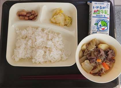 【献立】 肉じゃが はくさいのゆず風味 とら豆の煮もの ごはん 牛乳