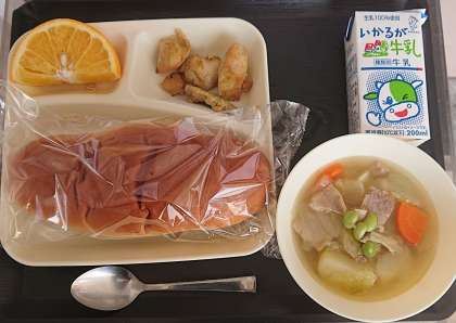 【献立】 鶏肉のカレー風味焼き 洋風煮 はっさく パン 牛乳