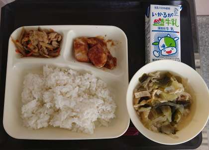 【献立】 鶏肉のみそバターソース 五目汁 きんぴらごぼう ごはん 牛乳