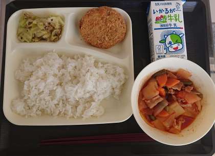 ツナとキャベツのバジルソテー ごはん 牛乳