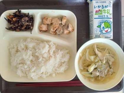 【献立】 さけのごまみそ焼き 五目汁 ひじきのいため煮 ごはん 牛乳