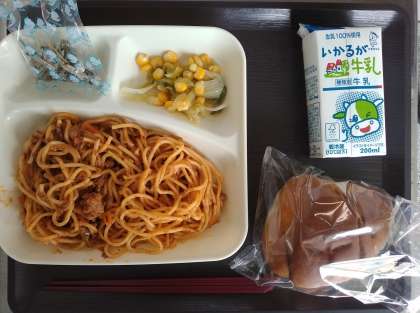 【献立】 ミートソーススパゲッティ レタスとコーンのサラダ ミニフィッシュ パン 牛乳
