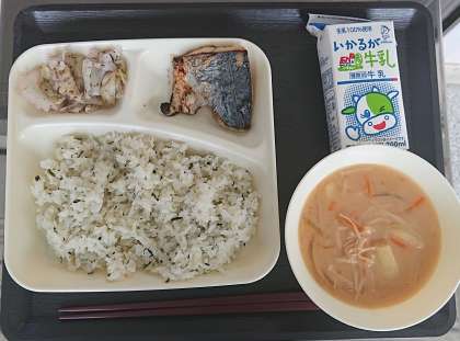 【献立】 さごしのつけ焼き みそ汁 キャベツの赤じそあえ 菜飯 牛乳