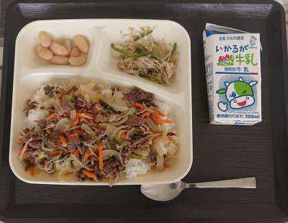 【献立】 牛丼 もやしとピーマンのごまいため 大福豆の煮もの 牛乳
