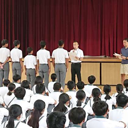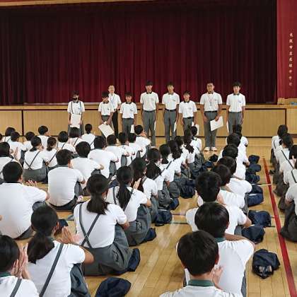 今日の全校集会で陸上部の賞状伝達を行いました。