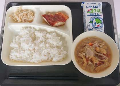 あかうおのしょうゆだれかけ 豚汁 もやしのゆずの香あえ