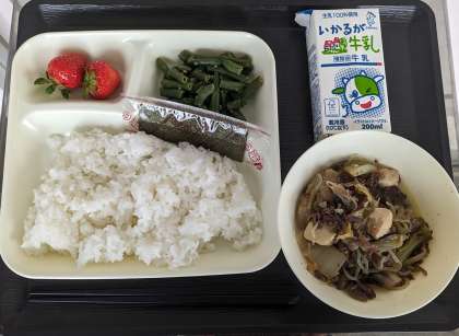 【献立】 すき焼き煮 さんどまめのごまあえ いちご ご飯 焼きのり 牛乳